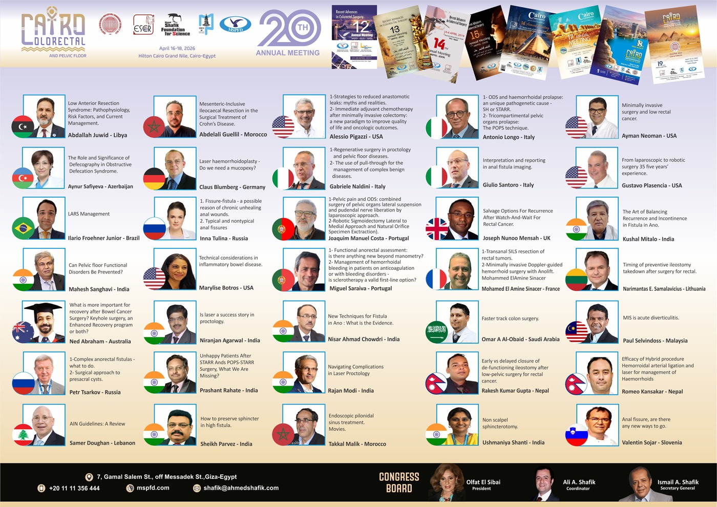 On behalf of ESCR & MSPFD and the program committee, it gives me a great pleasure to extend to you this invitation for the 20th Annual Meeting of the Mediterranean Society of Pelvic Floor Disorders (MSPFD) and the Egyptian Society of the Colon and Rectum (ESCR) on April 16-18, 2026 in Hilton Cairo Grand Nile, Cairo, Egypt.